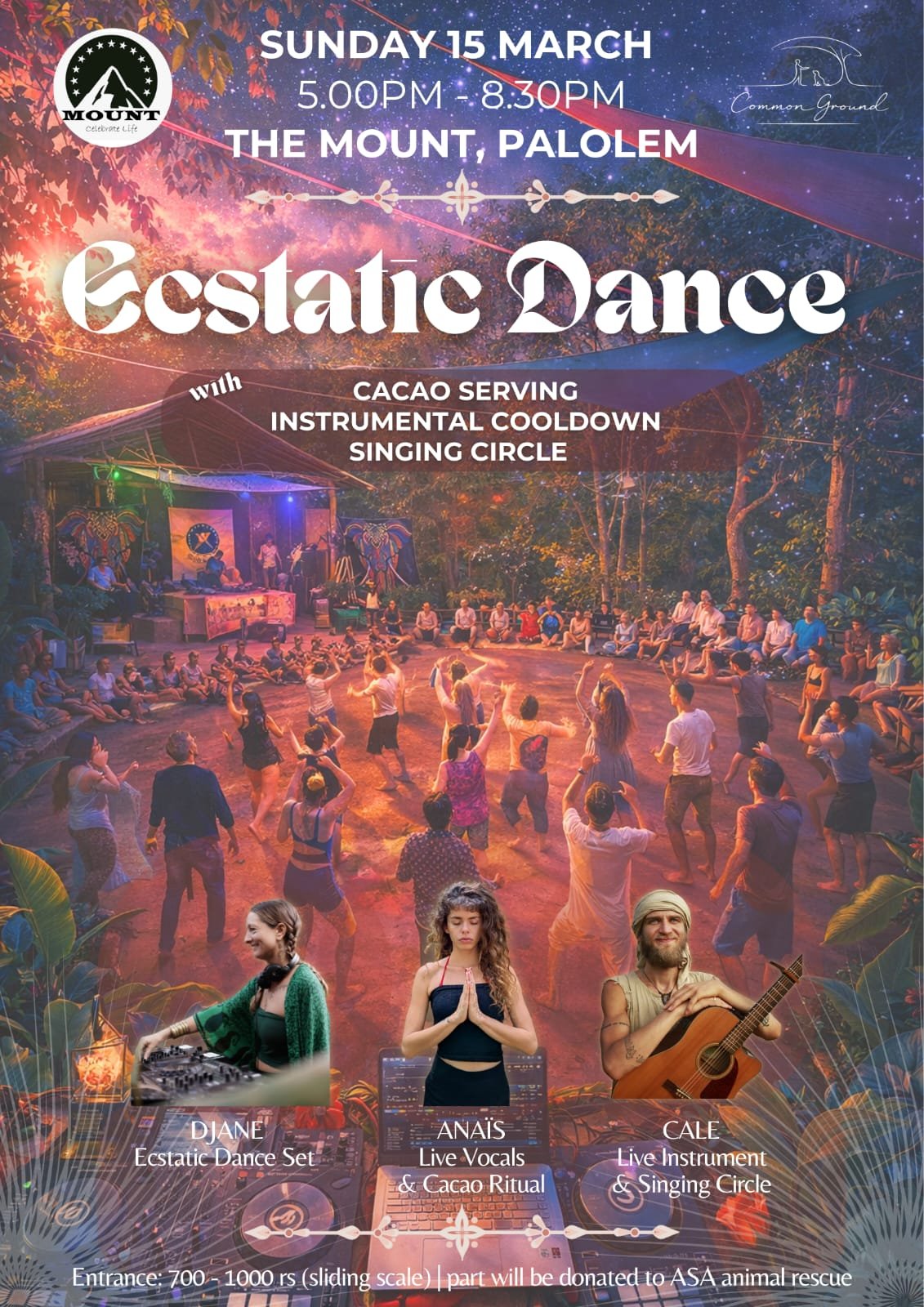 We begin by gathering in circle with a cacao ritual to open the heart and set intentions, flowing into a deep ecstatic dance journey, and landing softly with live instruments and a singing circle